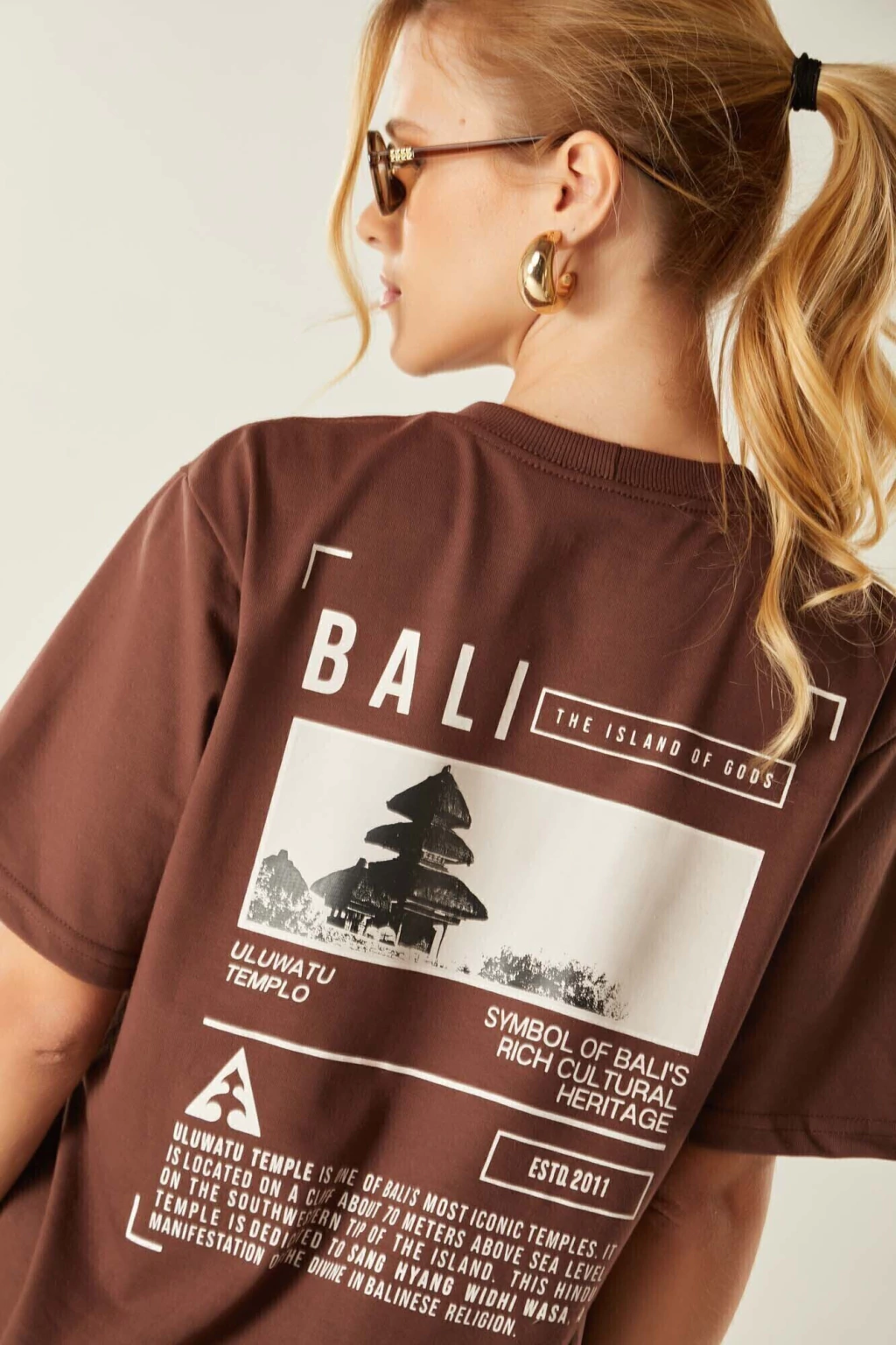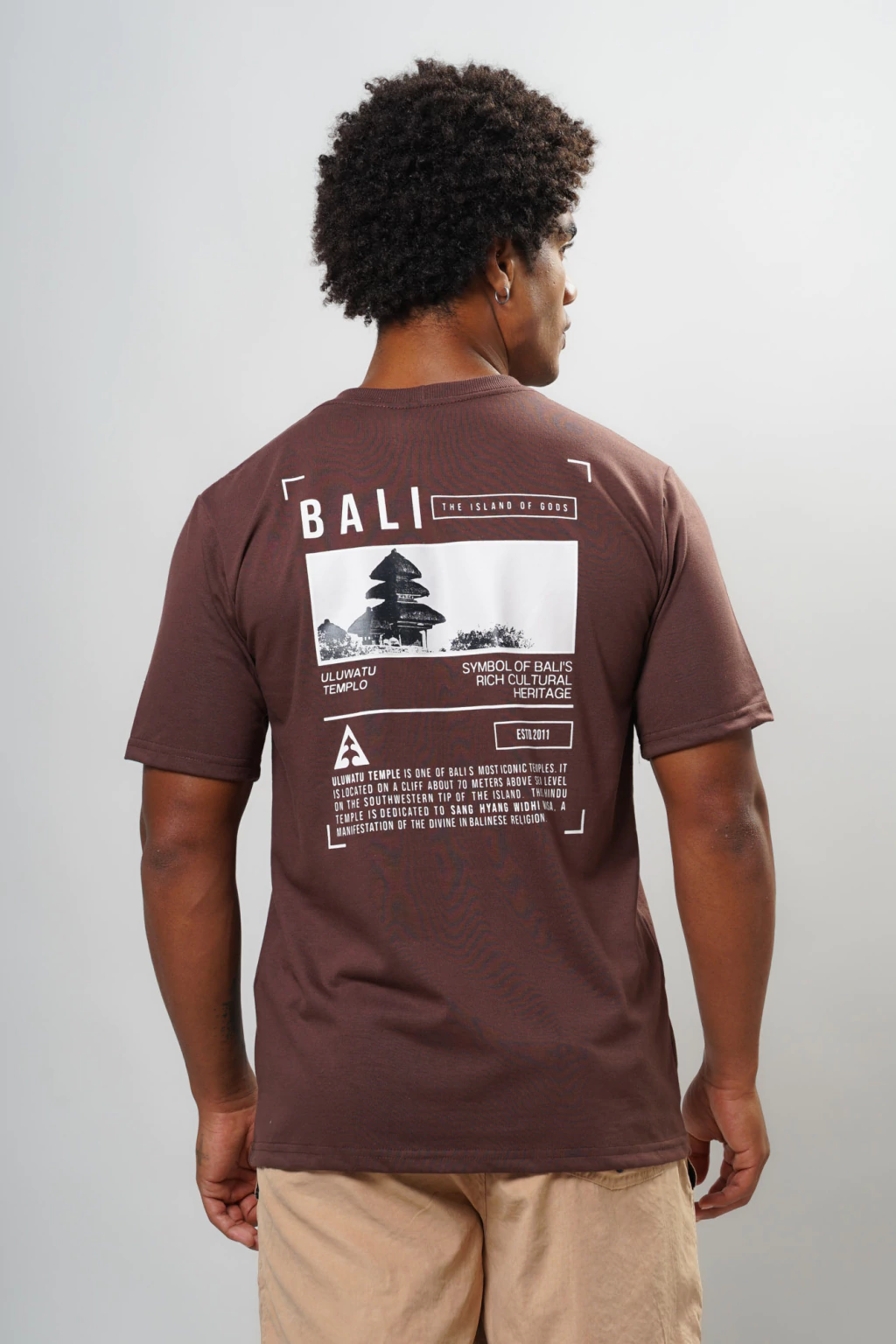 A estampa frontal é mais discreta e minimalista no centro do peito, mantendo o estilo clean e descomplicado. O grande destaque fica por conta da estampa nas costas, onde é reproduzida uma arte imponente e descritiva do Templo de Uluwatu, localizado na ilha de Bali, na Indonésia — um ícone ligado à cultura do surf e do espírito aventureiro.